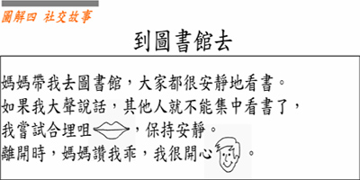 (b) 社交故事 ( Social Stories ) — 利用視覺提示,以故事形式介紹不同社交場合的背景資料,教導學生在這些場合應有的社交行為和態度,以及講述孤獨癥傾向、輕度孤獨癥、前庭失衡>孤獨癥邊緣、孤獨、重度孤獨癥傾向、輕度孤獨癥、前庭失衡>孤獨癥>孤獨癥邊緣、孤獨、重度孤獨癥>他人對恰當的社交行為的反應。社交故事有助自閉癥學生明白別人的要求,從而作出適當的行為和反應。教師亦可透過社交故事,向學生指出哪些是良好的社交行為,并嘉許和肯定孤獨癥傾向、輕度孤獨癥、前庭失衡>孤獨癥邊緣、孤獨、重度孤獨癥傾向、輕度孤獨癥、前庭失衡>孤獨癥>孤獨癥邊緣、孤獨、重度孤獨癥>他們作出的努力(見圖解四)。