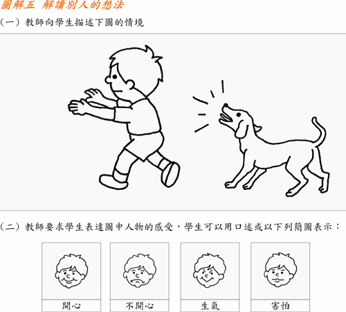 (c) 心智解讀 ( Mind–read ) — 自閉癥學生一般較難理解別人說話或行動背后的意思,亦無法體諒別人的感受,因此未能作出恰當的響應。教師可借助圖片,向自閉癥學生解釋別人在不同處境中的思想和感受,引導他們明白別人的想法,并教導他們作出適當的社交響應(見圖解五)。